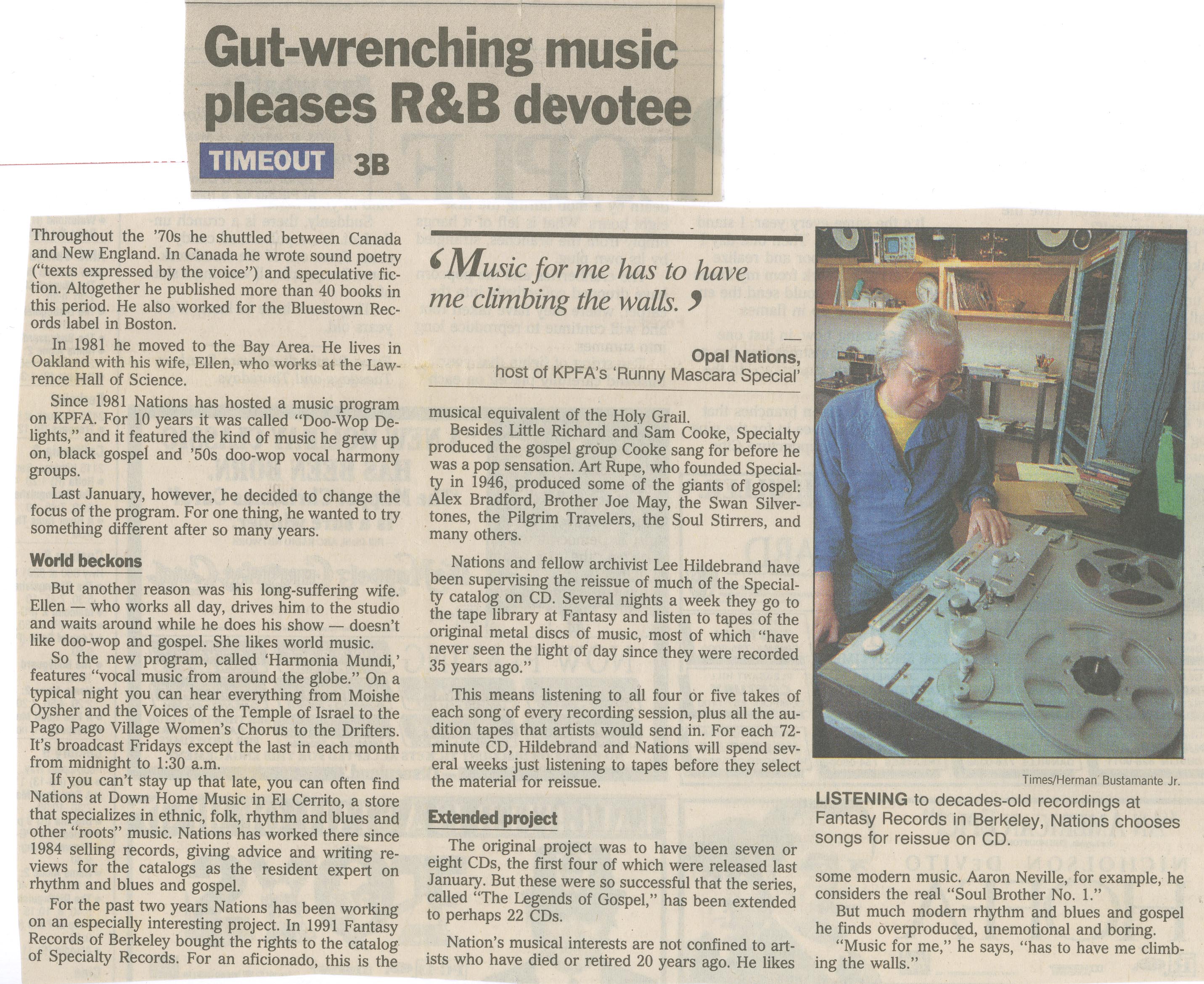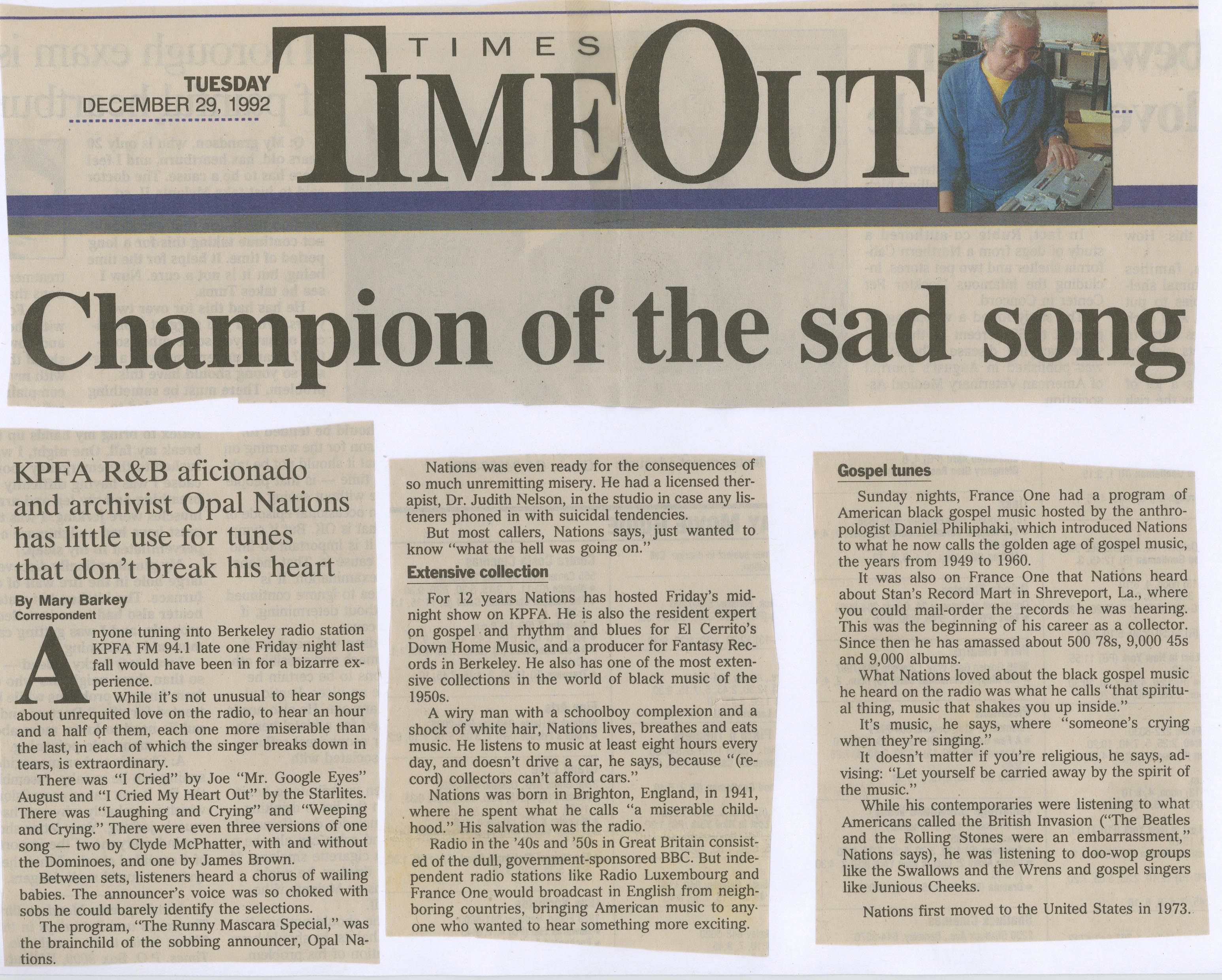 "Champion of the Sad Song" - West County Times, 1992 (about Opal's KPFA radio show, the Specialty re-issue project, and more...) Page 1 Page 2 Page 3 (photo) |