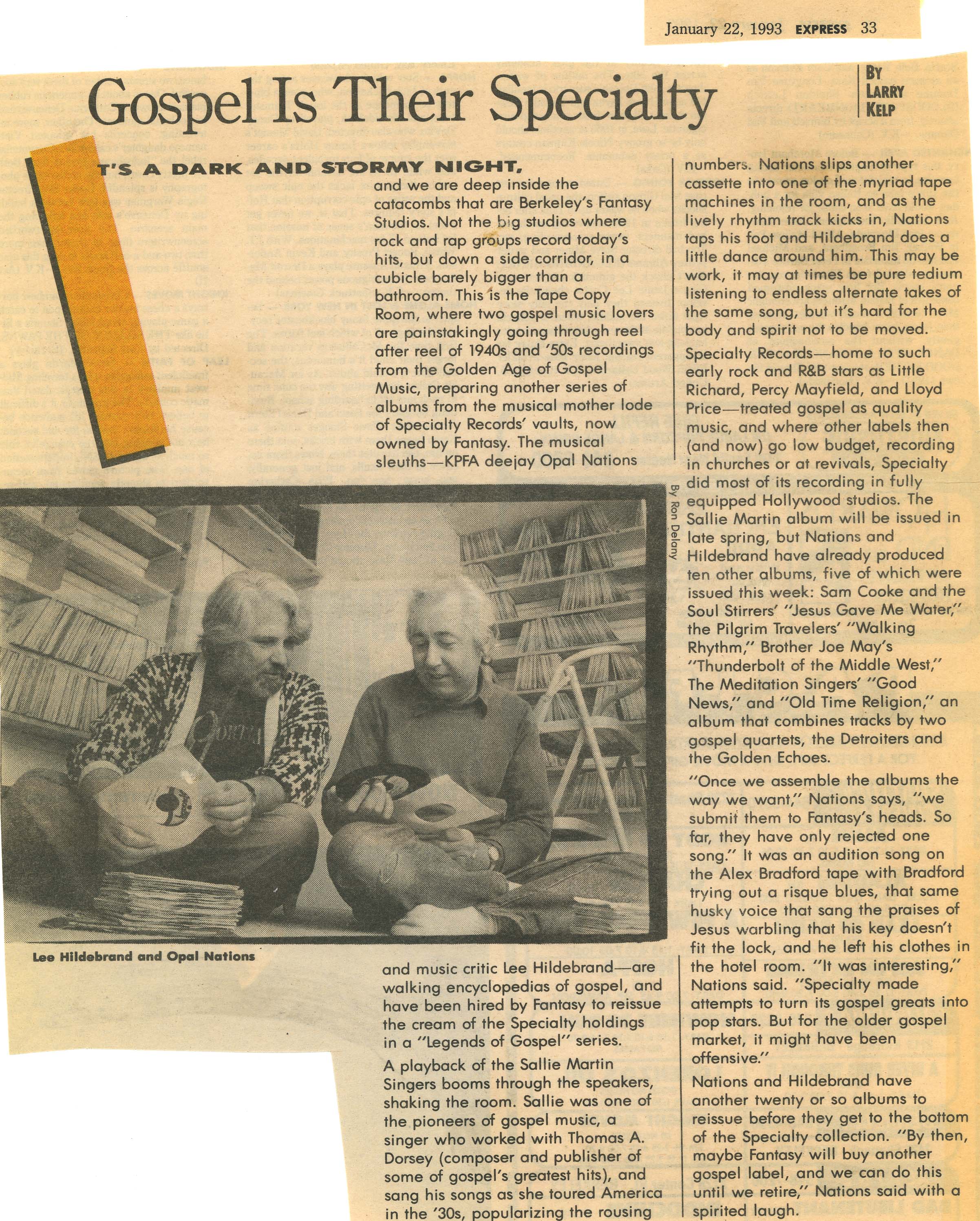 "Gospel Is Their Specialty" article by Larry Kelp for the East Bay Express, 1993 (about the Specialty gospel reissue project): East Bay Express article |